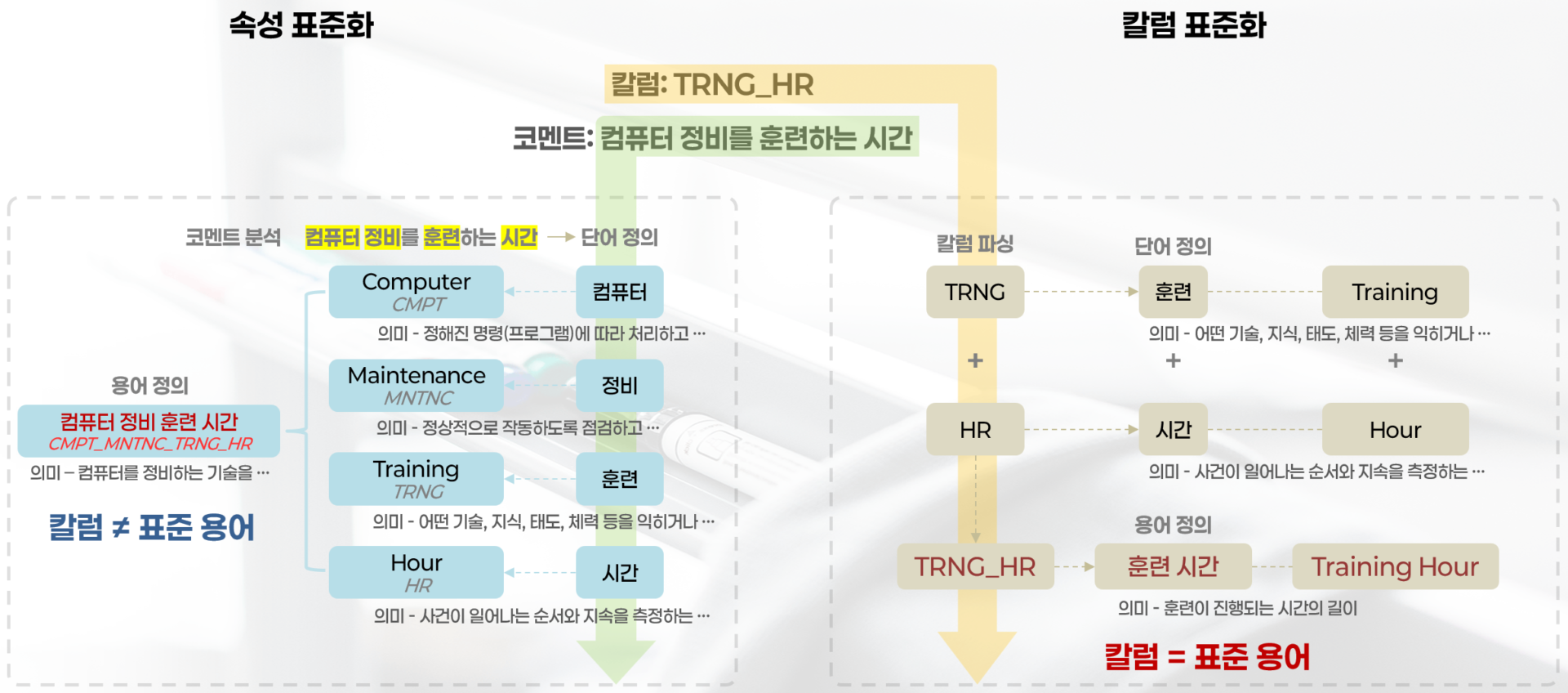 그래서 코트라에서는 위 우측 그림처럼 칼럼을 분석하여 단어와 용어를 정의하는 방식으로 표준화를 수행하였습니다.